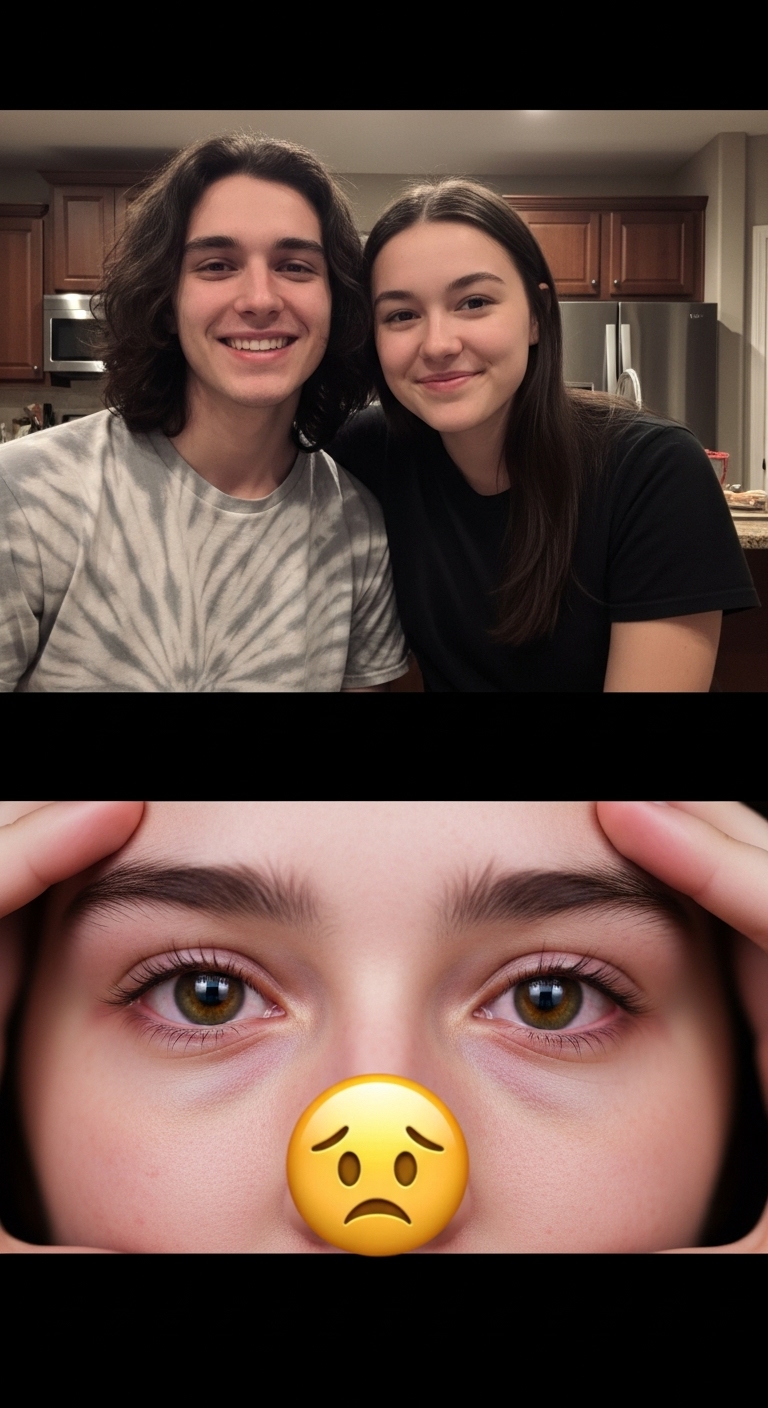 The image is presented in two contrasting parts, creating an immediate emotional shift for the viewer. At first glance, the upper portion shows two young people standing close together indoors, smiling gently at the camera. The setting appears calm and familiar, suggesting a moment of everyday normalcy and connection.
