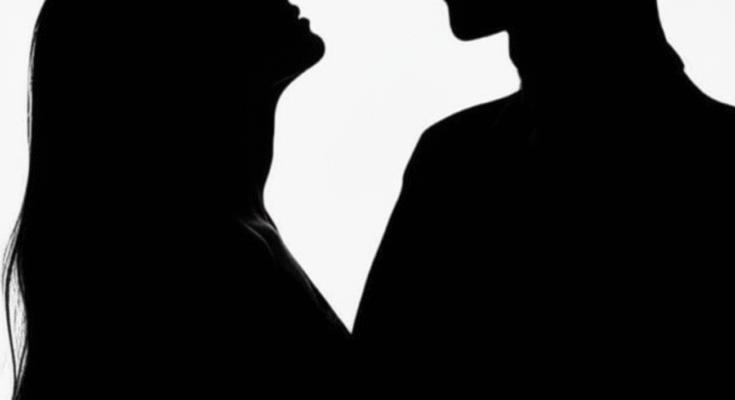 The image captures two silhouettes facing one another, frozen in a quiet moment that feels both intimate and unspoken. With no facial details visible, the focus shifts away from appearance and toward emotion, body language, and presence.