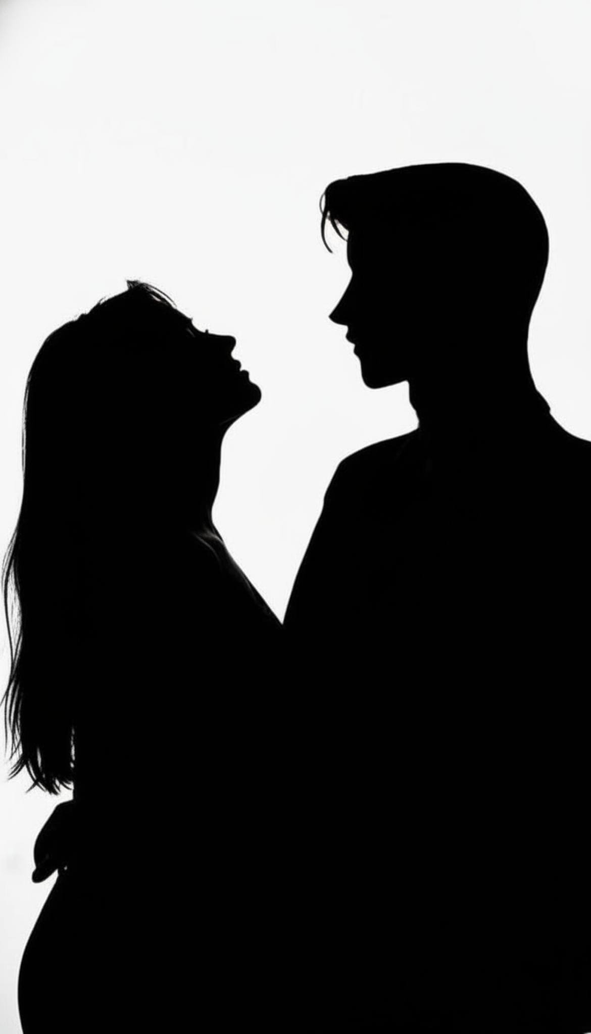 The image captures two silhouettes facing one another, frozen in a quiet moment that feels both intimate and unspoken. With no facial details visible, the focus shifts away from appearance and toward emotion, body language, and presence.