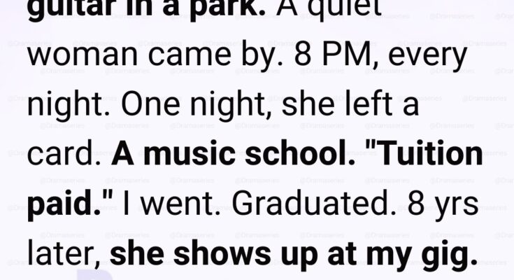 After a week, she left a business card: full tuition at a downtown music school, “till graduation :)” I thought it was a joke—but it wasn’t. I studied, practiced, and eventually got discovered. Yet she never returned to the park.